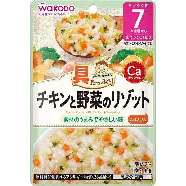 蔬菜(胡蘿蔔、西蘭花、甘藍)、米飯(日本)、馬鈴薯、炒洋蔥、雞肉片、切達乳酪、雞精、全脂奶粉、煮香菇、鹽/增稠劑(改性澱粉)、碳酸鈣、檸檬酸。