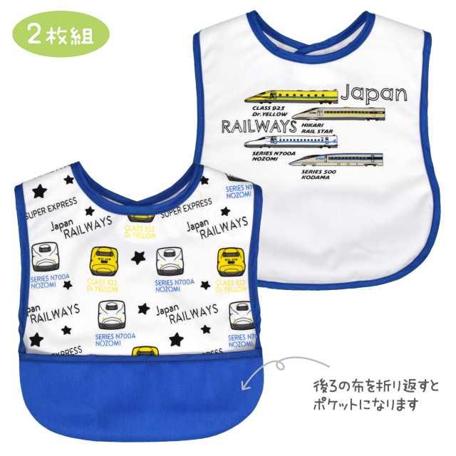 這套套裝包含兩件防水無袖圍裙,上面印有新幹線的設計。防水的材料可以保護衣服免受污漬。圍裙的背面布料可以翻轉成口袋,方便收集食物的溢出。圍裙上有包括Doctor Yellow、Nozomi、Hikari和Kodama等受歡迎的新幹線車型,套裝中有兩種不同的圖案。圍裙使用魔鬼氈固定,即使對於活潑的孩子也很容易穿脫。每個圍裙都附有名字標籤。