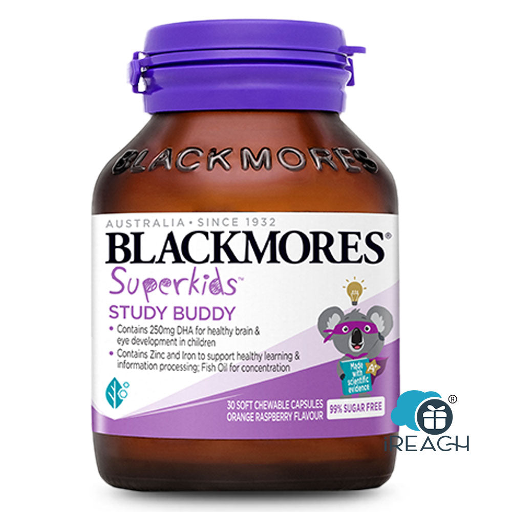 Blackmores Superkids Study Buddy是一種口感極佳的天然橙子覆盆子口味可咀嚼膠囊,含有天然來源的DHA,支持認知功能和眼睛與大腦的發展和學習。它還結合了鋅、鐵、維生素B2和B6,以支持孩子的免疫力和認知功能,這意味著更多學習的能量,較少的缺課,並能帶著微笑學習!
